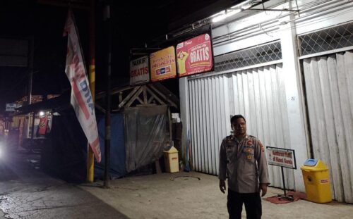 Terlihat Personil Polsek Malingping sedang melihat situasi pertokoan yang sudah tutup di daerah Desa Malingping utara, Kecamatan Malingping, Kabupaten Lebak untuk memastikan situasi aman kondusif. Jumat (6/9/2024) dini hari