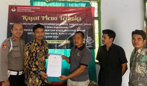 Bungas Banten, POLRES LEBAK – Bhabinkamtibmas Polsek Cirinten Polres Lebak Aipda Angga Setiawan, S,Sos., menghadiri giat rapat pleno terbuka rekapitulasi daftar pemilih hasil perbaikan (DPSHP) tingkat Desa Nanggerang Kecamatan, Cirinten Kab. Lebak, Dalam pemilihan Gubernur dan Wakil Gubernur Provinsi Banten serta Bupati dan Wakil Bupati Lebak tahun 2024. (07/09/2024)