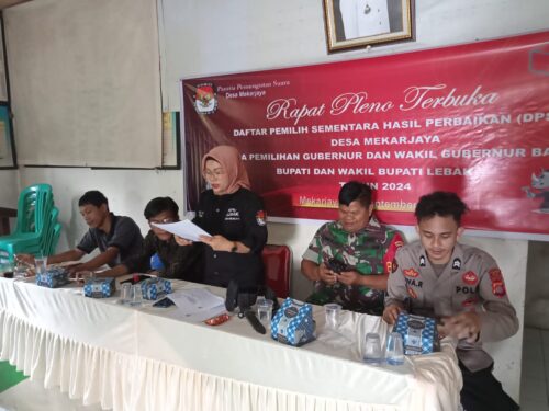 Dikegiatan rapat pleno terbuka di Aula Desa Mekar Jaya, turut hadir BRIGADIR REVA REVAZMI (Bhabinkamtibmas) Polsek Panggarangan, SERKA MAMAN (Babinsa dari Koramil 0314 Panggarangan), Sudirman (Kepala Desa Mekar Jaya), Agus Muh. Muklis (PPK Kecamatan Cihara), Asep Supriadi (PKD Mekar Jaya), Rika Purnamasari (Ketua PPS Desa Mekar Jaya), Hitah Alpiyah (Anggota) dan Dimas Andrianto.