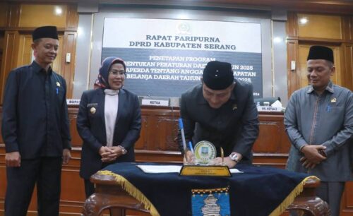 Bungas Banten, SERANG – Dewan Perwakilan Rakyat Daerah (DPRD) Kabupaten Serang menetapkan Rancangan Peraturan Daerah (Raperda) menjadi Peraturan Daerah (Perda) tentang Anggaran Pendapatan Belanja Daerah (APBD) Tahun Anggaran (TA) 2025. Penetapan dilakukan pada Rapat Paripurna DPRD Kabupaten Serang sekaligus ditetapkannya juga Program Pembentukan Peraturan Daerah Tahun 2025 di gedung dewan setempat pada Rabu, 13 November 2024.