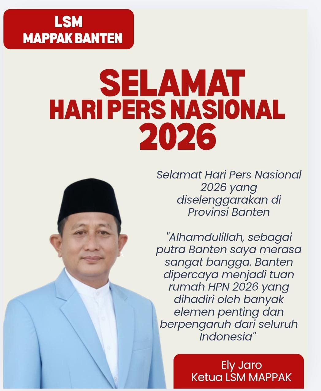 “Saya bersama seluruh jajaran LSM MAPPAK Banten mengucapkan selamat Hari Pers Nasional 2026 yang diselenggarakan di Provinsi Banten,” ujar Eli Jaro.