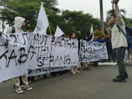 Bungas Banten, SERANG – Puluhan mahasiswa yang tergabung dalam Mahasiswa Serang Selatan menggelar aksi demonstrasi di depan Kantor Bupati Serang, Senin (15/9/2025).”Β Mereka menilai bahwa seratus hari kerja Bupati-Wakil Bupati Serang, Ratu Rachmatuzakiyah-M. Najib Hamas, gagal dalam memimpin Kabupaten Serang, Provinsi Banten.