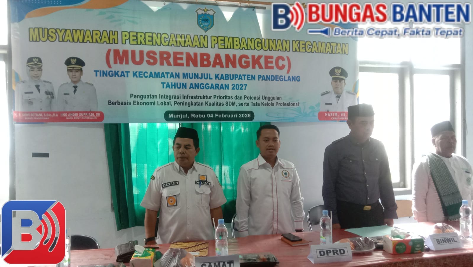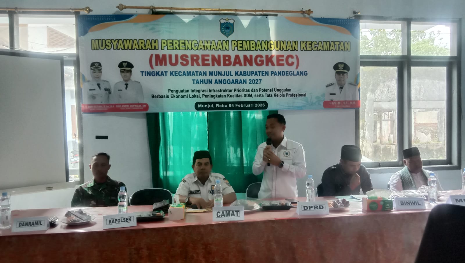 Bungas Banten, PANDEGLANG – Musyawarah Perencanaan Pembangunan Kecamatan (Musrembangkec) Munjul dilaksanakan di Aula Kecamatan Munjul, Kabupaten Pandeglang, pada Rabu (4/2/2026). Kegiatan ini dihadiri oleh Camat Munjul, Hasim SE MM, Kapolsek Munjul, Danramil, serta berbagai unsur terkait lainnya, termasuk DPRD Kabupaten Pandeglang Komisi IV, Maman Hermawan SH.