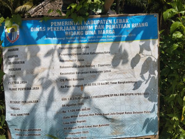 Diketahui berdasarkan Papan Informasi Proyek (PIP ) Bahwa pekerjaan dari, Pemerintah kabupaten Lebak melalui Dinas Pekerjaan Umum dan Penataan Ruang Bidang Bidang Bina Marga, Program Penyelenggara jalan, Kegiatan Penyelenggara Jalan Kabupaten / Kota, Sub Kegiatan : Rekontruksi Jalan Kumpay β Cipariama, Lokasi Kecamatan Banjarsari, Kabupaten Lebak, Penyedia jasa : CV. Putri Kencana, Nomor surat perjanjian : 600.1.8.2 / OJD-P2507-11995358/PPK/SP/RKJ-BM / DPUPR / APBD /2025, Tanggal 04 Agustus, Nilai kontrak : Rp 1.126.485,000,00.-Akhir pelaksanaan tanggal 17 September 2025