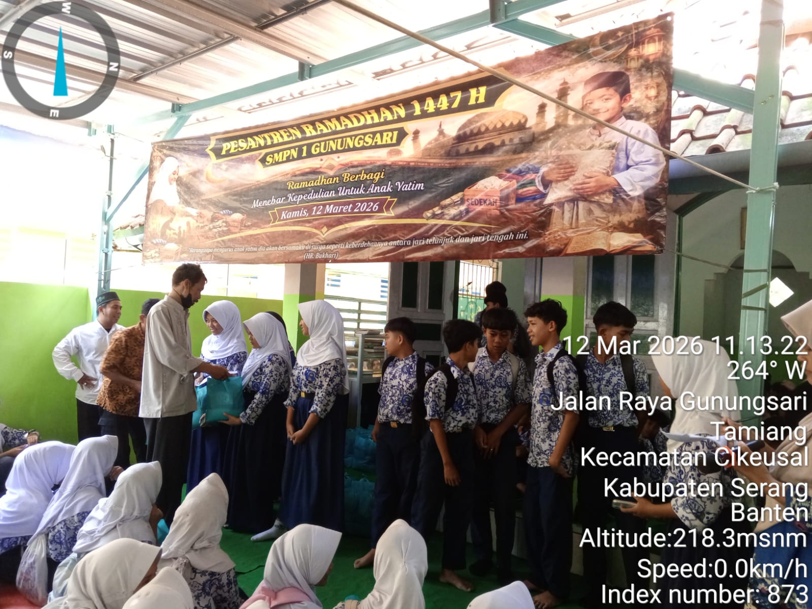 Bungas Banten, SERANG –  Sekolah Menengah Pertama (SMP) Negeri 1 Gunungsari menggelar kegiatan santunan anak yatim dan tebar sedekah dalam rangka Pesantren Ramadhan 1447 Hijriyah yang berlangsung di Musholla Al-Bayan SMPN 1 Gunungsari, Kabupaten Serang-Banten pada Kamis, (12/3/2026).
