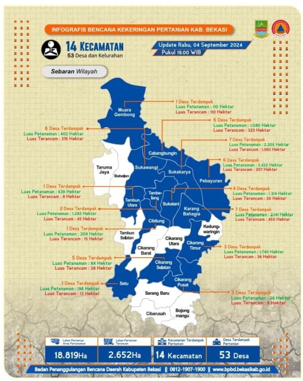 Pj Bupati menjelaskan, menurut data terbaru dari Badan Penanggulangan Bencana Daerah (BPBD) Kabupaten Bekasi, hingga Rabu, 4 September 2024 pukul 19.00 WIB, Kekeringan lahan pertanian di Kabupaten Bekasi yang awalnya melanda 99 desa, kini berkurang menjadi 53 desa yang tersebar di 14 kecamatan.